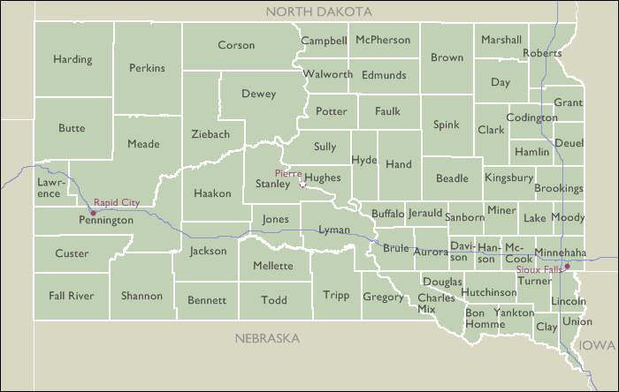Custer Lawrence Mellette Yankton Stanley Brookings Douglas Haakon Ziebach Moody Minnehaha Sully Buffalo Gregory Harding Roberts Potter Spink Kingsbury Brown Union Campbell Tripp Minnehaha Aurora Codington Harding Tripp Corson Haakon Brookings Clay Charles Mix Bennett Shannon Stanley Aurora Faulk Brown Miner Beadle Hutchinson Edmunds Hyde Walworth McPherson Bon Homme McPherson Buffalo Lake Davison Douglas Lincoln Clark Day Campbell Clay Codington Jones Marshall Hughes Deuel Meade Mellette Perkins Butte Hanson Perkins Bon Homme Jerauld Marshall Faulk Jackson Hutchinson Davison Potter Sully Kingsbury Sanborn Brule Yankton Jackson Dewey Lake Pennington Lyman Hughes Hyde Todd Hand Day Meade Custer Todd Corson Lincoln Beadle Clark Fall River Ziebach Grant Hamlin Jerauld Brule Lawrence Sanborn Moody Edmunds Lyman McCook Hanson Pennington Turner Roberts Hand Gregory Bennett McCook Charles Mix Turner Grant Walworth Spink Union Deuel Miner Shannon Fall River Dewey Butte Jones Hamlin