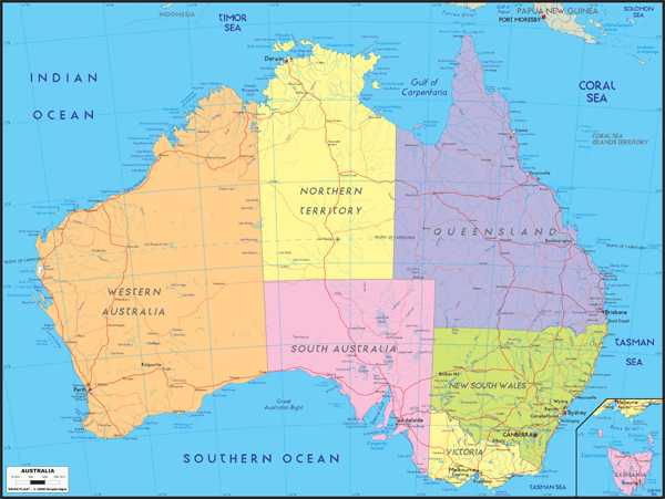 This wall map, the Australia Political Wall Map, was created with state-of-the-art printing technology, using attractive colors and easy-to-read text. This map is not available in any store and is ideally suited for business or light reference use.