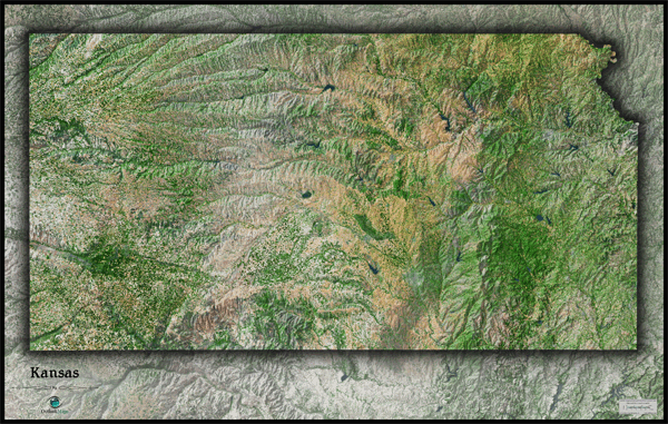 This Kansas Satellite Map dramatically displays the "Sunflower State" as seen from outer space. The stunning aerial image was created from spectral data (satellite image data) taken from NASA's Landsat satellites which was then combined with 3D shading of the landscape to provide a natural looking satellite map that has 3 dimensional depth helping to distinguish terrain much more than traditional "flat" satellite maps. The natural beauty of the great plains really comes to life in this Kansas satellite map. The farm lands, prairies, subtle hills, and numerous rivers that streak across the state are very prominently shown. Specific hilly regions such as the Smoky Hills, Flint Hills, Red Hills, and Blue Hills are all visible in the map. This splendid Kansas Satellite Map is incredibly detailed too: each printed pixel of resolution in the map is equal to 153 ft (47 meters)! This high resolution allows identification of urban cities and towns, crop fields (including circular irrigated fields), rivers, major highways, lakes, airports, and even large parks within cities. You'll see details more clearly on large sized maps, so we recommend ordering the largest map which can fit on your wall. Labels were intentionally omitted to create a natural, uncluttered look. This spectacular Kansas satellite map will definitely provide hours of excitement: you'll feel like you're exploring the great state of Kansas for the first time!